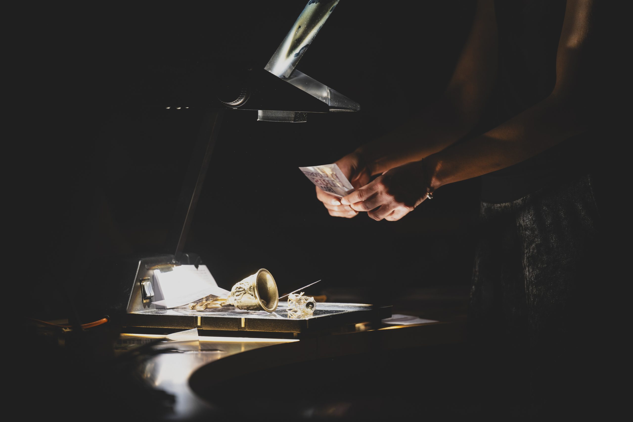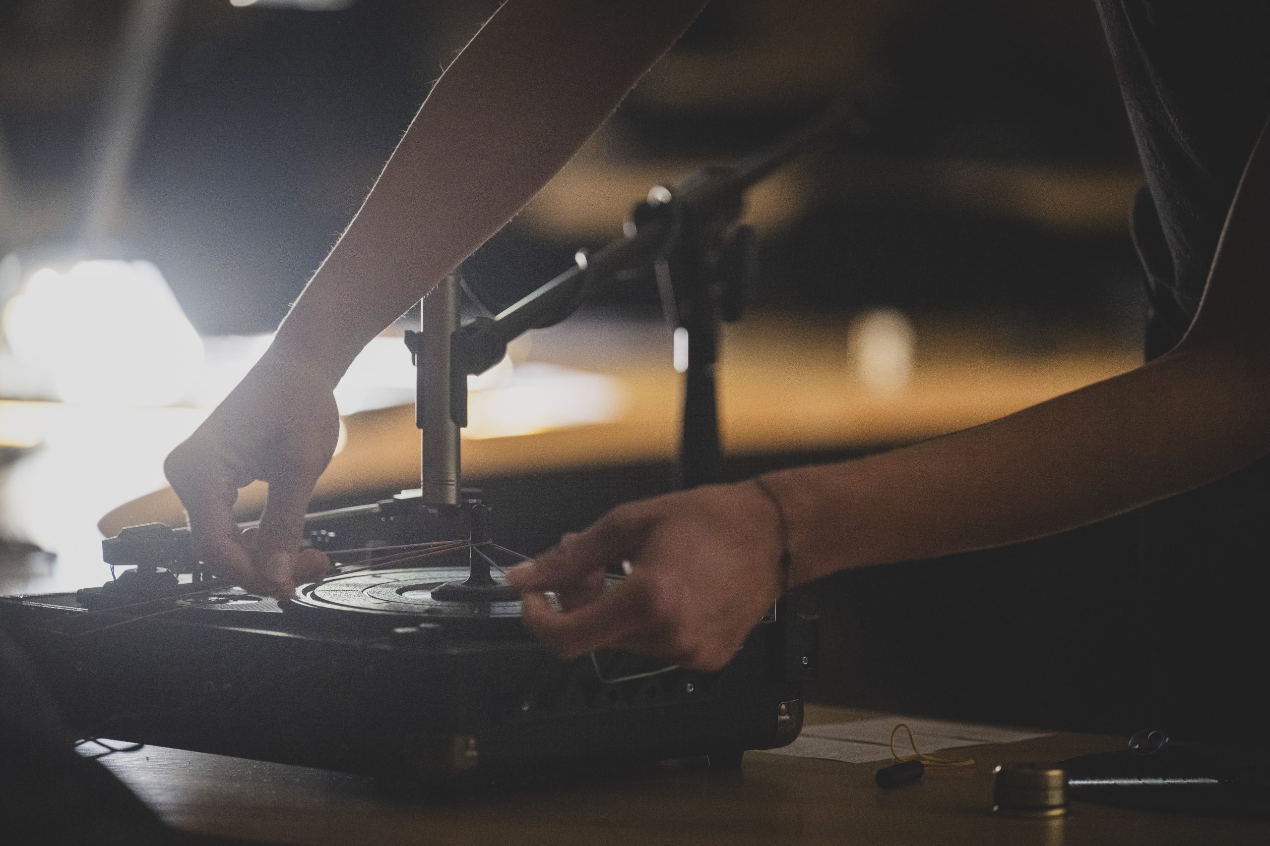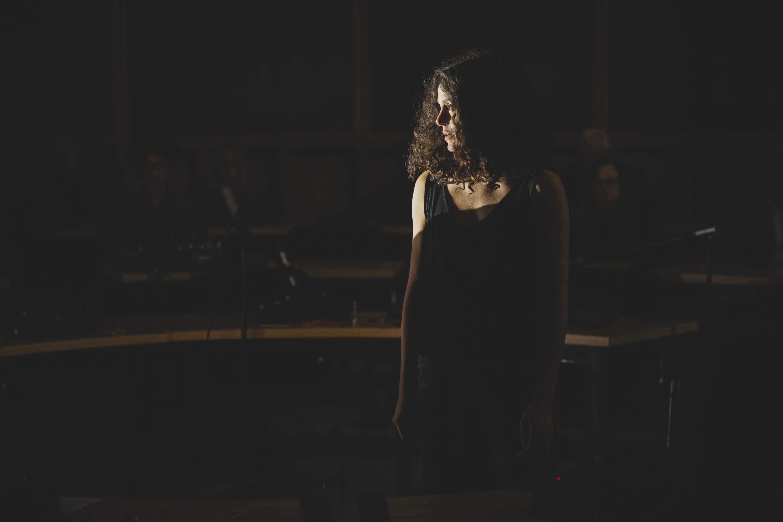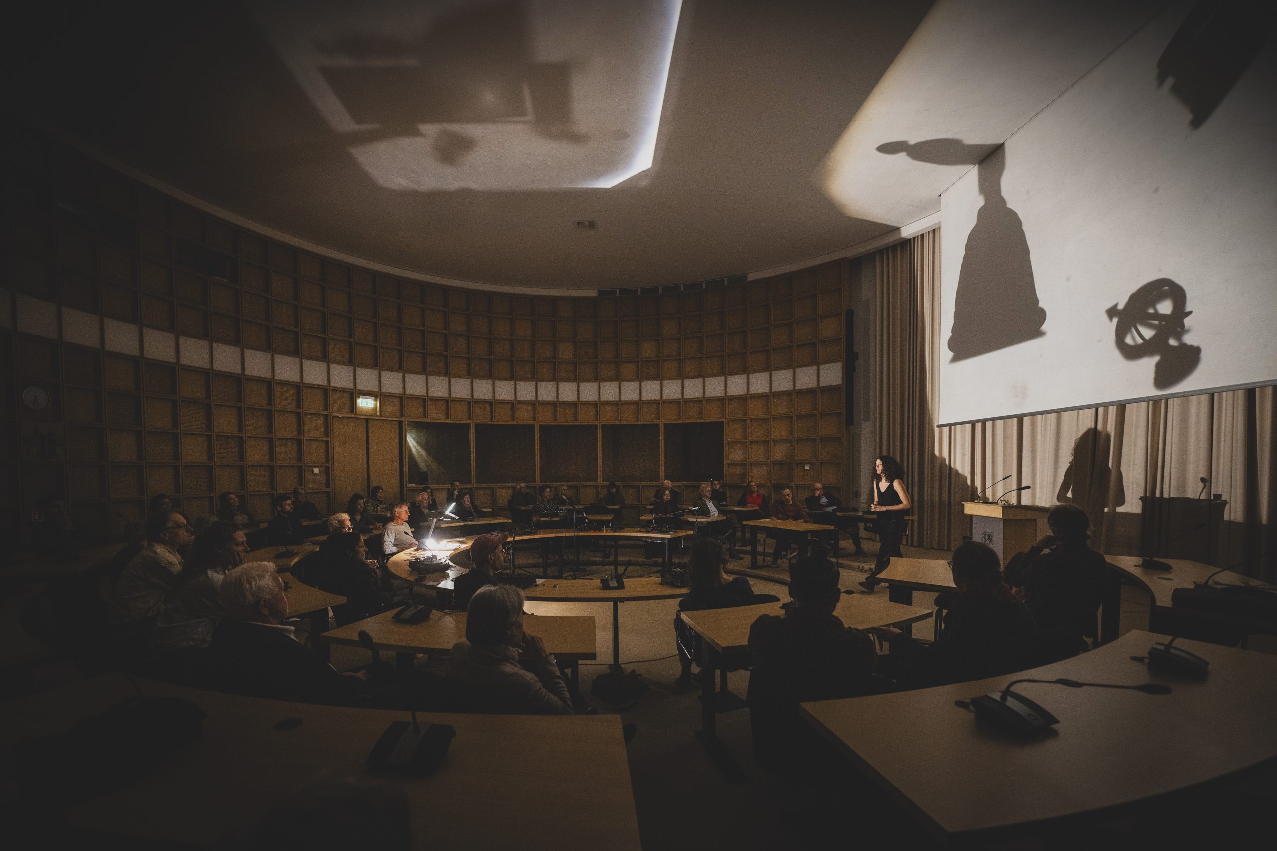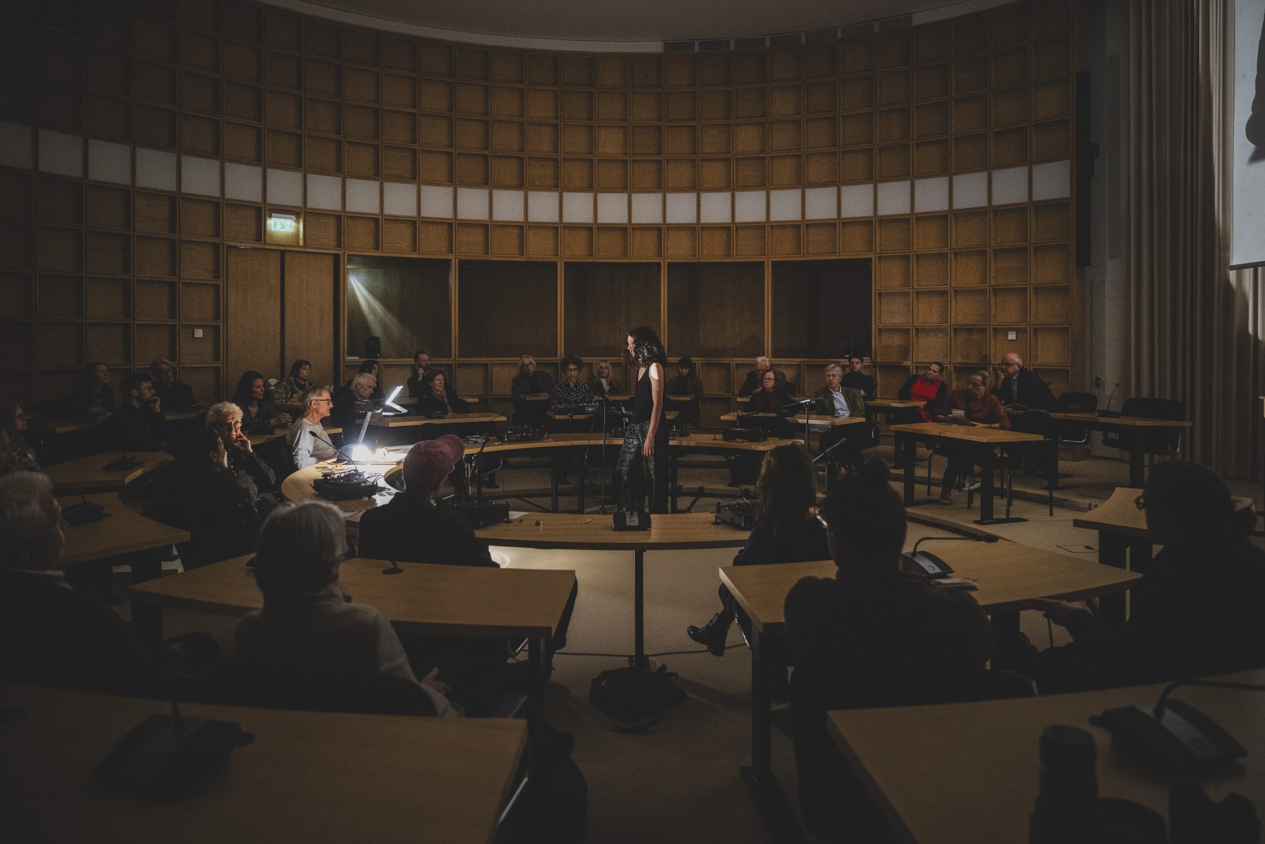 Die Aufführung findet größtenteils im Dunkeln statt – in einem Raum, der an einen parlamentarischen Diskussionssaal erinnert. Das Publikum sitzt an kreisförmig angeordneten Tischen, von denen viele mit einem eigenen Plattenspieler ausgestattet sind. So entsteht ein kollektiver Hörraum, in dem individuelle Wahrnehmung und gemeinschaftliches Erleben ineinander greifen. Zuhören wird hier zu einer politischen Praxis: als Aushandlung, als Verantwortung, als Möglichkeit eines anderen Miteinanders.